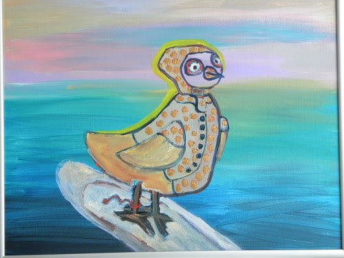 an instant favorite! how cool is a chicken in a raincoat on a surf board!